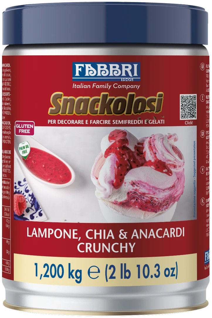Polewa do marmurkowania Snackolosi Malina Crunchy to gęsty sos typu variegato o intensywnym malinowym smaku, z dodatkiem nasion chia i kawałków orzechów nerkowca.
